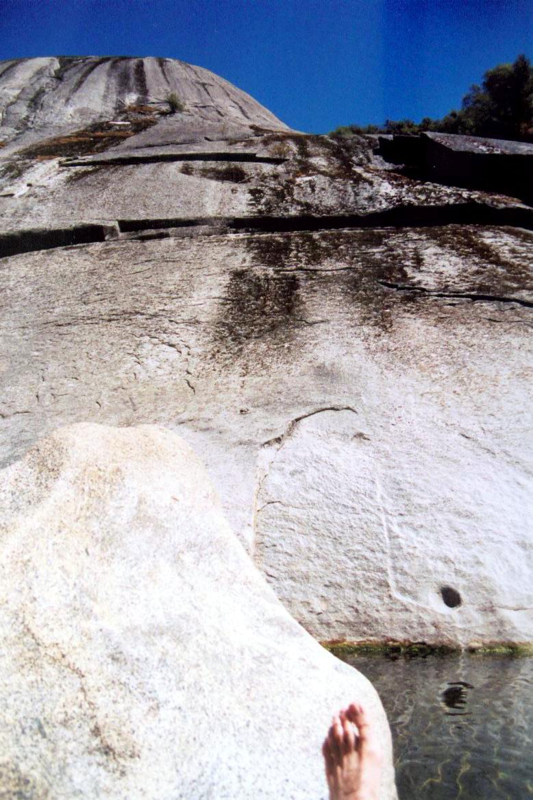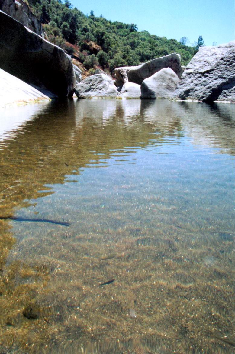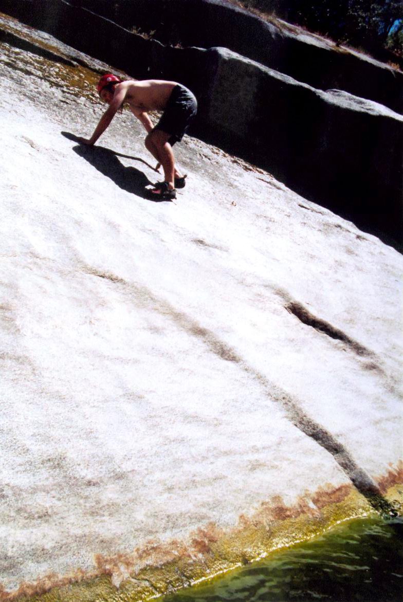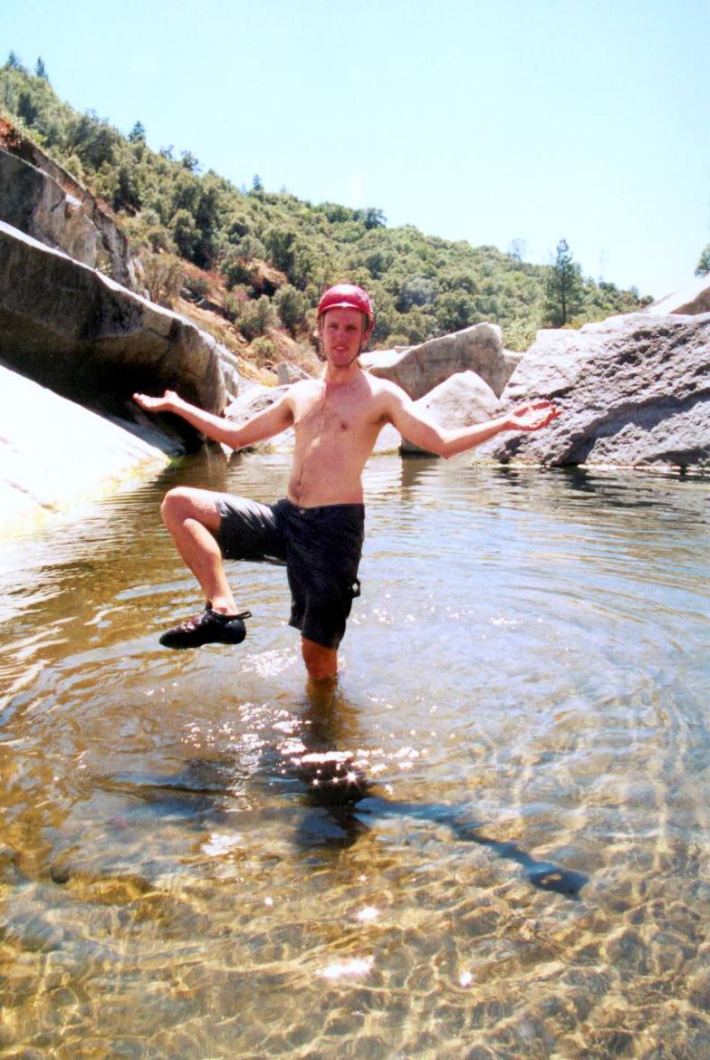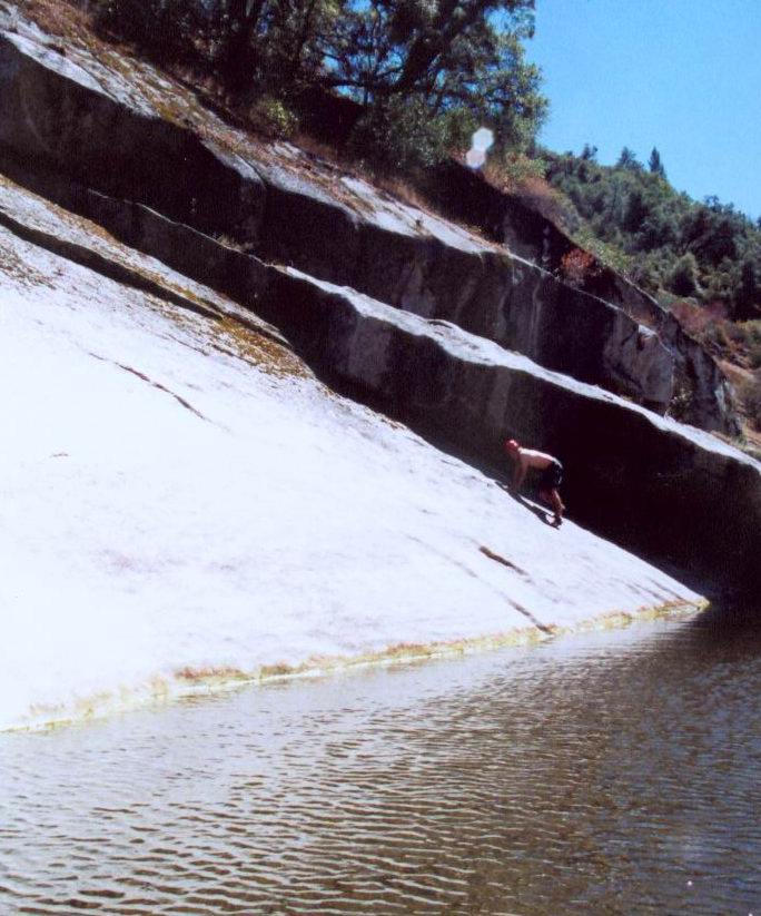 And then the photos pick up... The sunday started in good form again, with a disapointing breakfast at a cafe in Placerville. A leisurely start and back to the cliffs, with the intent of doing one of the multipitch routes on the big dome on the other side of the river. We started it. Scott led a fun hairy 5.7 pitch (I'd refused to lead it, it was actually a lot better than it looked) and then I did the 5.4 traverse next pitch. Then Scott's feet got too hot (I'll blame him) and the belay station was a perfect height for a two rope rap in to the swimming hole. Who could resist. (My feet were hot too) Two ropes reached exactly to the waterline, and we didn't even get our gear wet. Perfect. After a bit of a cool down, it was time to pretend to climb again. I put my shoes on and had a go at "Trout Fishing in America" a 5.11 traverse above the water line, then a second pitch up to an abseil station on the main wall. I made it to just past the second bolt.