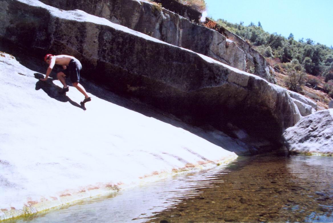 7 Months in California, and I still haven't climbed in Yosemite. Still, I'm covering some ground. For some reason we decided that Cosumnes River Gorge near Placeville (on the road between Sacramento and Tahoe) was the next destination on the Scott/Karl climbing circuit. In true well paid engineer type practices, we drove up early (9am) Had a leisurely lunch in town, chatted up some hair dressers to wangle a poster out of them, meandered on out to the crag sort of mid afternoon, decided it was too hot, had a swim, lounged in the shade for a bit, swam some more, and then decided it was time for a climb or two. The area was no-where near as big as we had first thought, and we overshot the clif we were trying to get to by about as long as the entire trail in all over again. A very scenic climbing location, even some scenic looking locals having a swim as well. We did a moderate gear route that I wimped out of the crux on. I skirted around and belayed scott up, who then re-led the climb. And so began/continued the saga of who has to climb first, and who is really climbing harder and who is rescuing who blah blah blah :) Part of the reason we were here though was to teach scott some aiding, we'd read about this cool 5.12c thin crack that we were hoping to aid. (single pitch local test piece thing) It too was much smaller than we expected, though a very quality route. It was actually just as well it wasn't much longer, or we would have run out of gear. I only have one set of nuts, and at the time had no RPs, and only one cam small enough to fit. Scott had fun, and I got to sit in the shade and pretend to pay attention to belaying him. Then it was time for yuppie dinner. No cooking on the whisperlite here, no siree. Back into town, and chatting up the lovely serving girls at a bakery/restaraunt back in Placerville. Just as we were ready to go out and look for a place to stay, (Not that we'd pay for that though, eating well all weekend is one thing but you must have some camping on on a camping trip) Scott discovers that he's locked his keys in the car. Or in the boot more specifically, and then left the car open. "A new way of locking the car" says Scott. Whatever. The locksmith arrived, and proceeded to use every trick in the book to get into the car, eventually succeeding, a little over an hour later, using a gadget he'd just got, and never used on Honda's before. It got him in, and us a new key in a little under 10 minutes. The locksmith was quite impressed with his new gadget. He certainly earnt his money that night.
