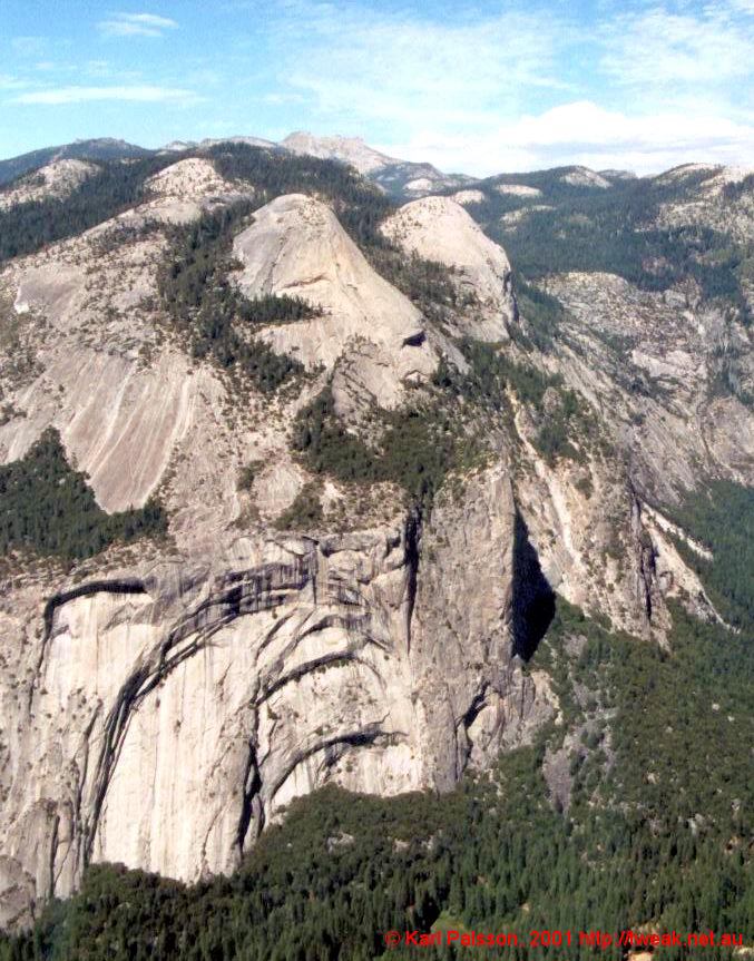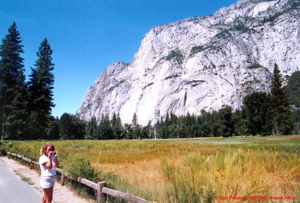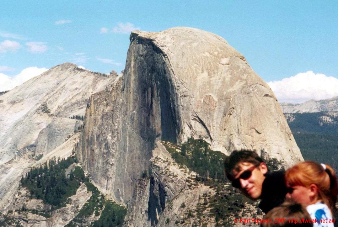 My First trip to yosemite! What a shambles the organisation was. We had about 8 people keen, but everyone had their own agendas. So we ended up with three mini trips. Greg and Steve wanted to leave friday afternoon, early, and were going to return saturday night. I wanted to go saturday morning, and return late sunday night. Adam and Jenna were going, but no-one had any idea when they were going, or even if they would go. The other distinction was that Nick, Mike and Myself wanted to go up Half Dome. Anastasia was along for the ride and was tough enough for anything. So we borrowed Greg's cisco car, an impressive Buick Regal. (Our cisco car had been returned by now, and mike didn't feel comfortable that his car would make the distance.) The buick was awesome, a total old persons car, but cool nonetheless. Stereo controls built into the steering wheel, split cabin climate control, v6 herbs for takeoff and landing. A real cruiser. We took off, early from my place, with the boot full of shit and headed up through livermore and out through stockton. I got tired and Nick took over for the drive down into the valley, and demonstrated why automatics should never be driven in the hills. At least, not by people who always drive automatics. Nice guy and all, but you've gotta use a lower gear dude. We got out just before one of the tunnels for our first look at the valley. Couldn't see much from here, but we could see a couple of groups of climbers on the wall above the road. (Cookie cliffs I believe) Headed on down into the valley for a better look, and also with the foolish goal of getting a campsite. Who were we kidding, the rangers actually even laughed at us. We had a great look at the valley, and went to camp 4 to see if greg and steve were around (They were on the waiting list there) Didn't find them, so went on up to bridalveil campground, on the southern valley rim, on the road to glacier point. Set up camp, quite a few sites remaining up here, then went off to check out glacier point. (It's just as well we did set up camp first, after glacier point we went down to bridal veil falls, down in the valley proper again, and by the time we came back up the camp was full)