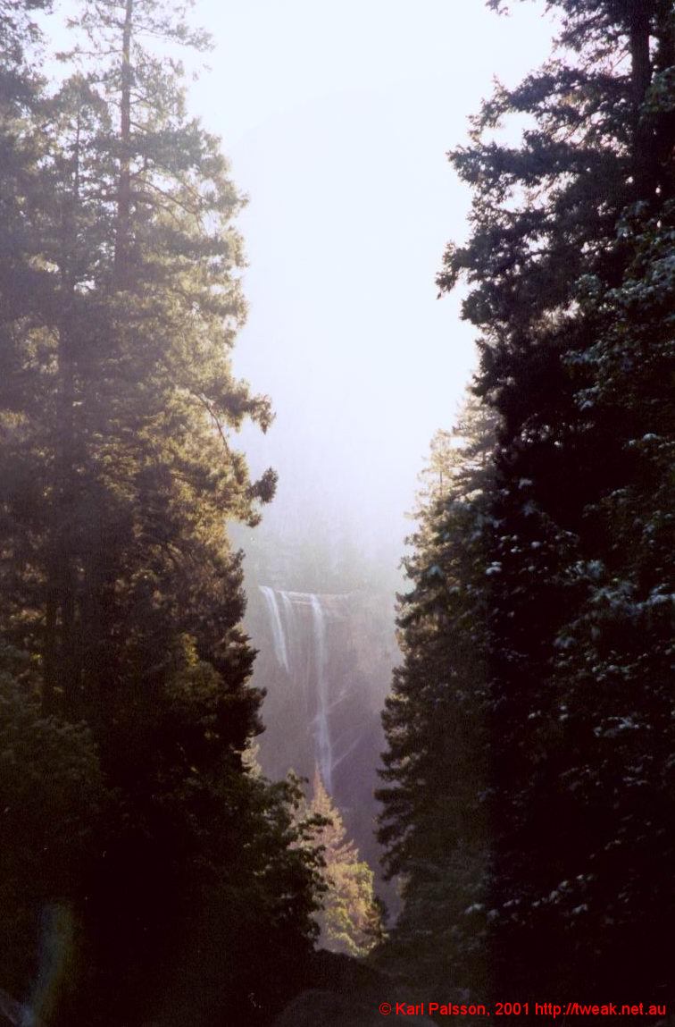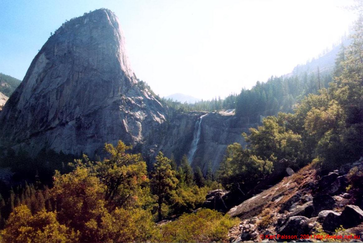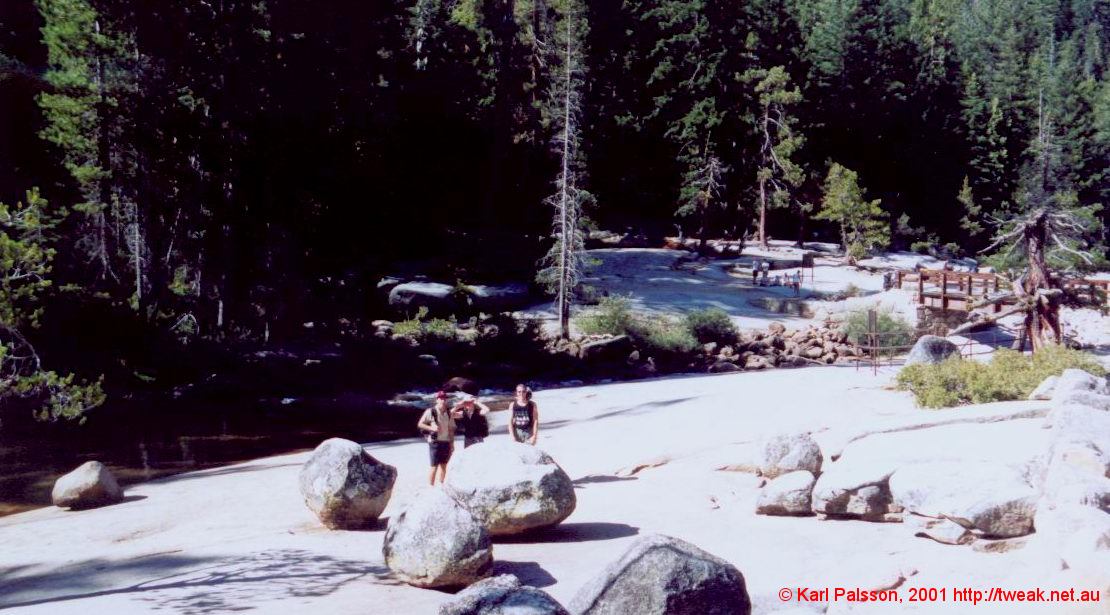 From here it was all just slogging down hill. We stopped for a well earned swim in the Merced River above Nevada Falls, Liberty cap above us, then headed on down. We were still seeing people coming up at this stage, (though only one or two by the time we reached the river again) and they were looking less and less likely to succeed. We met one couple carrying a 1L gatorade bottle each, empty, wearing shorts only, with sandals. From Nevada Falls we went down the Mist trail, which gave us a better view of the falls, and took us down the opposide side of the valley from where we'd gone up. Quite a nice waterfall from up close, with a lot of water on it. This track also took us down past the top of Vernal Falls, which was swarming with people. People everywhere was the name of the game all the way back to the carpark. About 15 minutes from the carpark is a toilet block and a water fountain, beside a bridge over the Merced, which was the staging point for people returning in dribs and drabs. People everywhere, splashing water on their faces, waiting for group members, resting on the ground, you name it. Waited here for a while, then it was onwards to the car, and the long burn home. An excellent trip, and a very worthy day walk.
