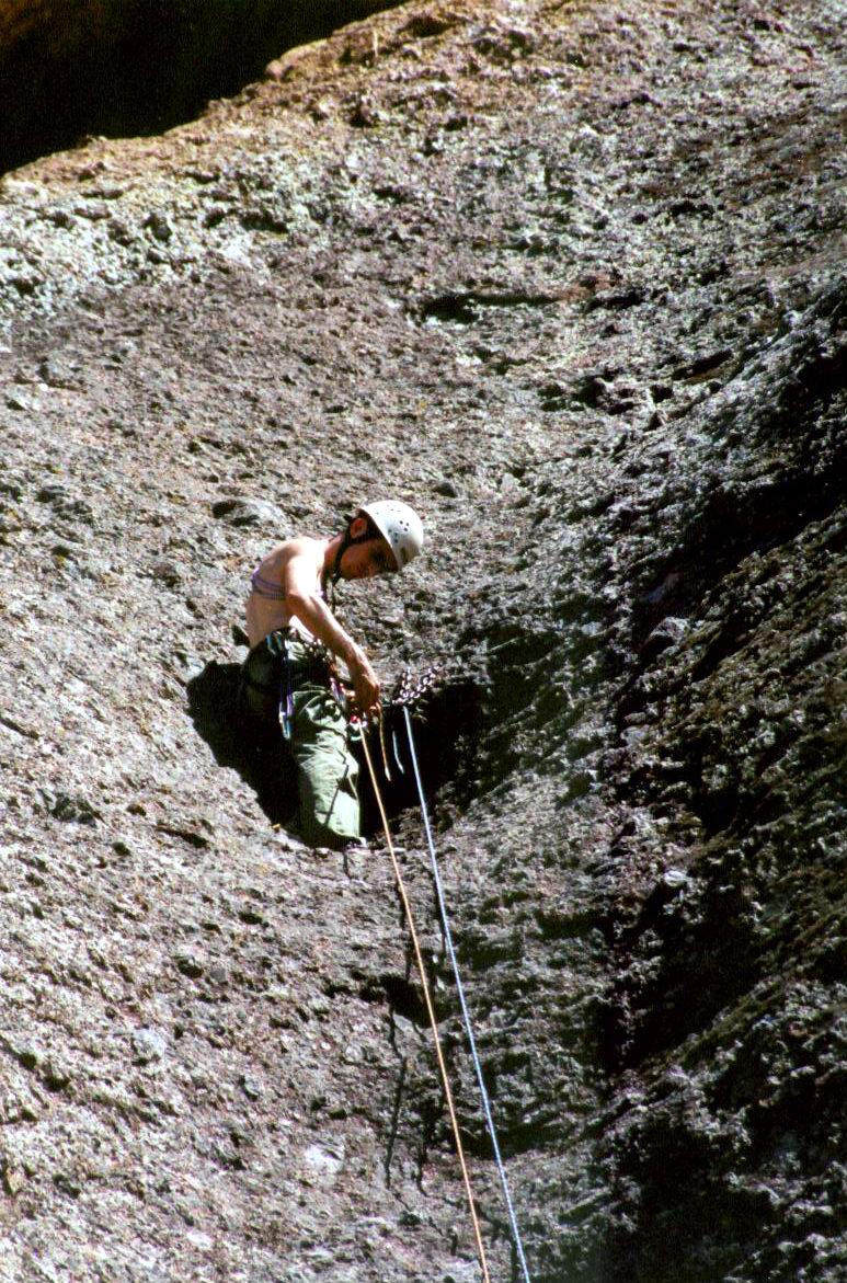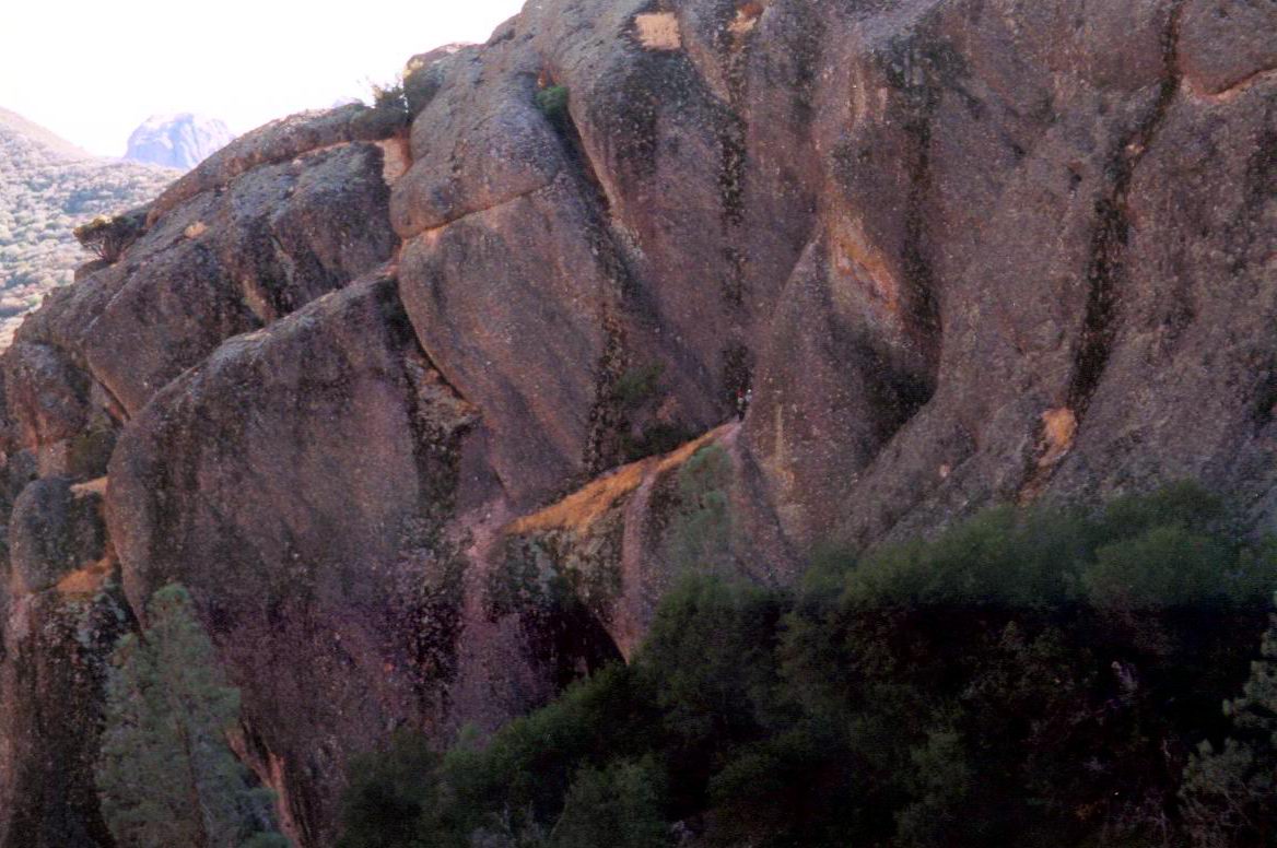 pinnacles-09.JPG Flumes North wall. Much nicer, we did a few climbs here, then found out they were all new since the guidebook. Some very nice stuff here. Kibbles & Bits, and Rebecca's Sailing (both 5.9) were both enjoyable. |