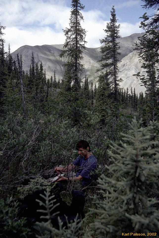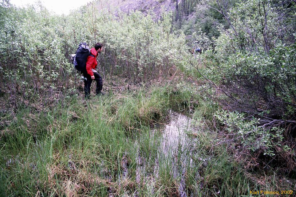 | This was the hardest walking we did. We were on day 4 by now, and certainly weren't as fresh and nimble as we once were. (I think we were probably at steady state though, I could actually have kept walking like this for days if we had had more food, you just sort of get into a rythm) This was Taiga at it's best. We tried walking down by the river, but it was thick vegetation, constant re-routing to avoid the interminable braidings of the creek (Hot Springs Creeek apparently, though very very very few people take the time to even try and look for the springs by the time they are in this area) and uneven ground.