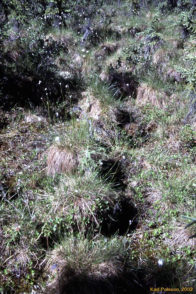 The hill side wasn't much better. Don't pay any attention to the "green" shading on the map, it's pretty meaningless, just about the entire south side of the valley is vegetated, with small patches of open ground. It was mostly sodden, trackless, tussocky, and generally hard work. The spruce is a hard tree that doesn't give when you run into it, it just pokes. The other tree, The willow like shrub shown surrounding mick pumping water above is rubber and twiny and awkward to push through. Lovely stuff :) Don't let anything I say stop you from going here.