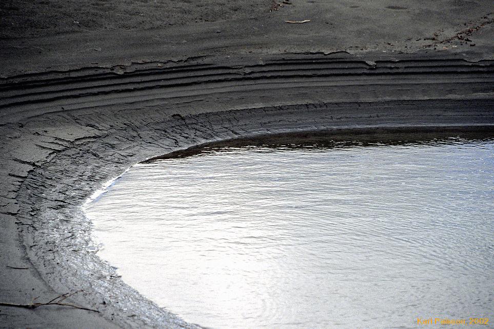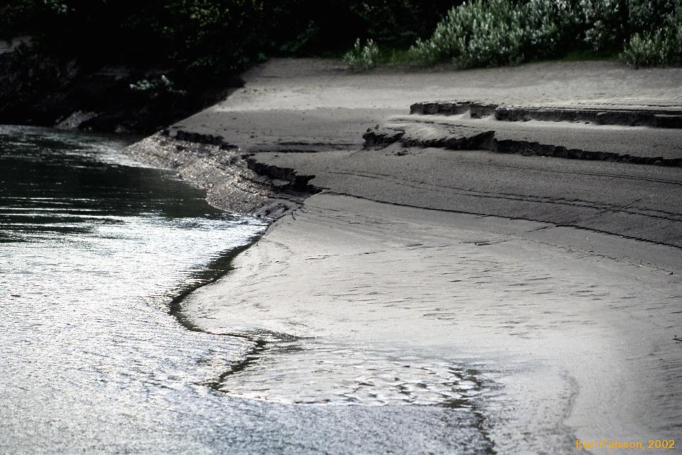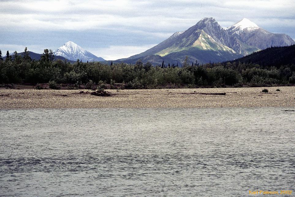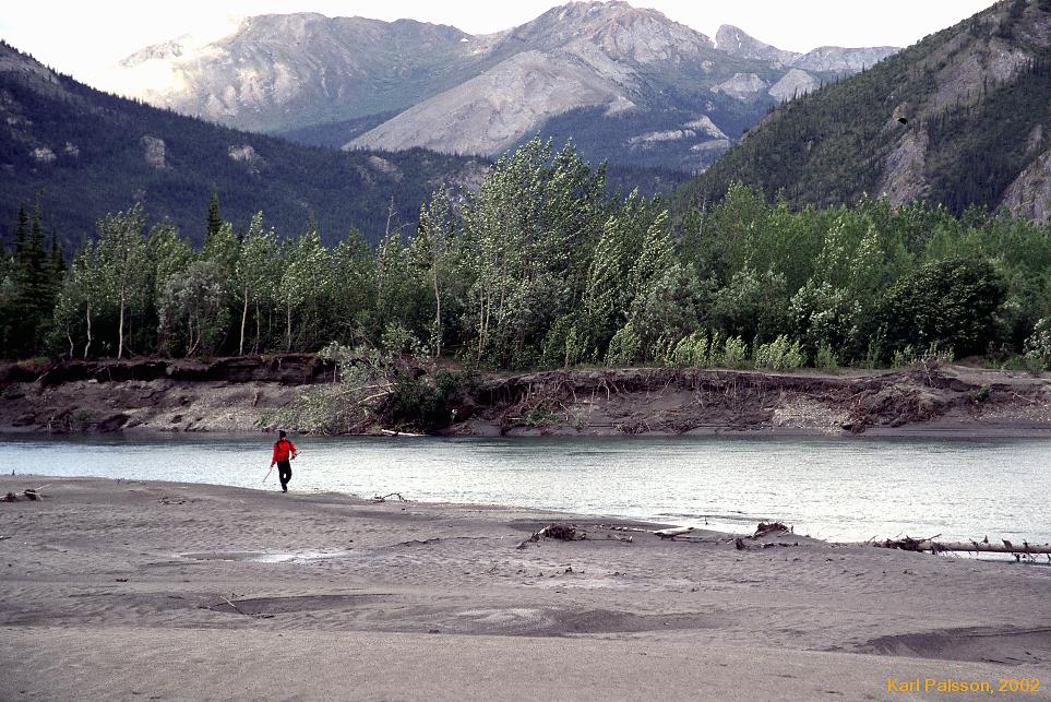 Had some hard time determining exactly how far down the valley we were around here, massive contour intervals got us repeatedly. We didn't want to be to high and have to deal with all the cliffs we'd seen on Mt Takahula on the flight up. (Unmarked on this map, marked on our USGS map, just N of Lake Takahula) Eventually got down and around to the river again, (after having to skirt numerous steep sections on Mt Takahula's northern flanks anyway) and immediately stopped for lunch. It was glorious to be out of the vegetation and back onto sand and rocks by the river.