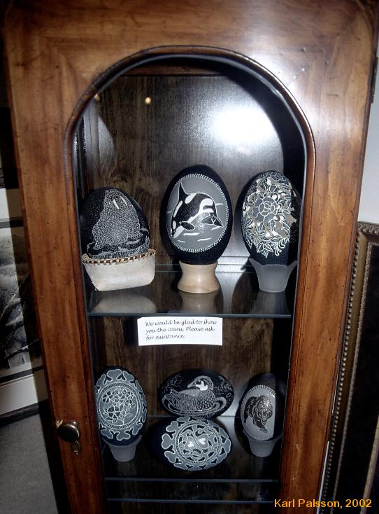 The next day (Saturday 6th of July) we drop Scott off at the airport, he is headed to an IEEE conference in Vancouver, then Mick and I go into downtown fairbanks for brekky and souvenir shopping and tourist type stuff. We don't fly out till 1am monday morning. Look at a gallery that has painted emu eggs. Go up to the reccommended UAF museum. Nice museum. Shitty gift shop. Next stop Alaskaland. A big "themepark" in Fairbanks. Generally dismal displays, lame tourist shops. Really lame. Almost fleamarketish, very very few good souvenirs. And I was trying to spend money. Nice big air museum though, well laid out, lots of stories of Russian/American pilots during the war and the LendLease program. Lot's of RV'ers in the carpark.