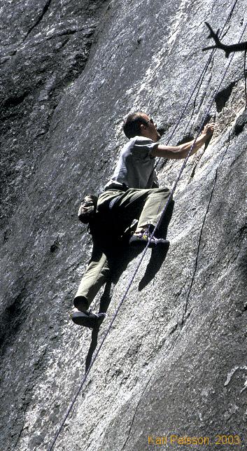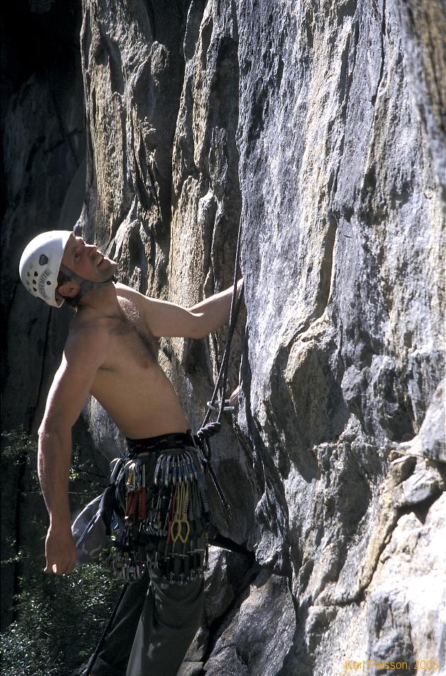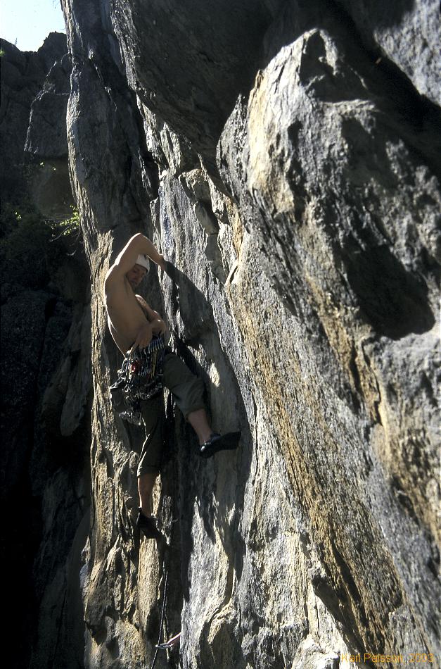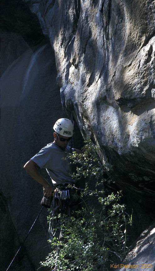 A full rope length's later, and I come up to the tree and head on up to the top of the big ledge. A short awkward move, but nothing as demanding as Alex's first pitch. After a lengthy wait for the party above to lead out of the way, Alex heads off. This pitch looks a bit ugly, running with water, but he leads it with aplomb, something I don't think I would have had the nerve to do. He probably thought I was doing it to him deliberately. :) I'm real glad I wasn't leading that wet horror. You can tell that the route would be stellar without the water though, as it's still lovely climbing even when wet. I get the next pitch and feel real good on it, leading nicely up to what at first glance seemed to be a great ledge. But wasn't. Alex comes up and is looking downright miserable. His new "casual" shoes are killing his feet, and he doesn't feel at all like doing the next pitch. I've not really prepared for this, and am tied into the anchor, but after a short rest, and some water Alex is as good as new, and leads off up the mantel without out even a grunt. We reach the top and after a quick piccy on alex's camera from the highest point, we head down to go and chill out in the meadow for a bit.