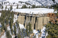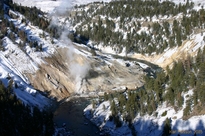 Rent snowshoes for two days, so we can take them with us out to cooke city and back. Drive off around 11, to explore the other sights along the northern loop road. Stop at tower falls and decided to walk ou tthe 2.5 miles to the falls. I have seen pictures of really nice falls, that I'm sure said tower falls, but I'm perhaps mistaken. :) We walk out with the snowshoes in our packs. We are walking out the road from summer, and it is quite well packed. Quite an enjoyable walk, we spot two coyotes, some squirrels, and a few birds. Plenty of elk beside the road. (on the drive) Eventually reach Tower Falls, after passing a family of skiers. I think this route would have been more suited to xc skis. The falls are a bit of a disappointment. From the overlook they are mostly obscured by trees, and the trail to the bottom is closed due to a track washout. Oh well :) It was a nice walk out anyway. We snowshoe back, to try that out, which is fine, but not overly different to walking on that road.