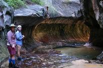 Ruth on the walk into the Subway, Zion NP |  Reflections from a pool in the upper subway, Zion NP |  The Subway, Zion NP |  Margaret and Ruth in the Subway, Zion NP |