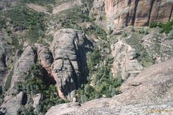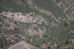 Next, another fairly easy lead for scott. He got to climb up to a notch, and then downclimb with a toprope about 15m down the other side. Fucking joy. I sat up in the notch, at the bolt, with a backpack, and decided that the bolt had a ring on it for a damn good reason, as I rethreaded it so I could have the rope security too. Scott was belaying from a ledge which was plenty good enough to stand on, but if I came barrelling down the chute, there was a reasonable chance that I'd continue over the edge, and pull him behind me.