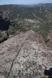 I won the first pitch, something I normally hate doing, but I sucked it up, bouldered up and left, and climbed right up to the first bolt. Yay for me. I normally hate running it out off the ground. Climbed up to some anchors, and then decided to rerig on the ridge itself.