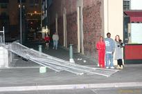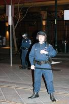We started at the cinebar, which stayed largely quiet and serene all night, as it ususally does. The bouncer was doing a superb job of not letting in crazy wild people who'd been kicked out of other bars, and the barman were giving us all beads anyway. We stepped out a couple of times to walk around the block (or try to) and see what the city was up to. Not only did we get to see allll those cops in riot gear, but there were even choppers! with floodlights sweeping the carparks and other streets. Crazy. Lots of people on the streets, but mostly just all hanging out and chatting. Definitely felt like being at a prison though.