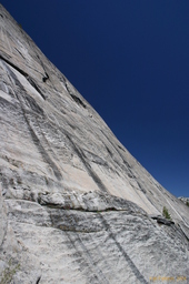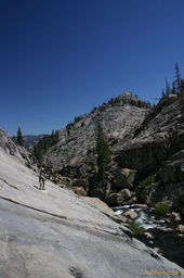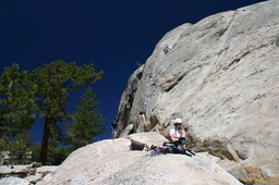 Trapper Dome is close enough to walk straight from camp. We wander over and run into a nice pair of gents from Fresno, Lon and Dave. They are pleased as punch to have some people here to show their crag to. They are leading Tao when we get there, which looks cool, but we run up Drill Instructor/Good Deed/whatever to the right of it first. Which was really easy, and served only to warm us up nicely. Which was a good thing I guess. We rap down and I lead Tao (5.7), which is much more interesting, with some nice balancy traverses. A bit short though. We try and toprope the direct start, which we can't determine if it has a name and is a unique climb or not. I need to interject here and say that the kings canyon and sequoia area climbing guide, (vernon, moser, hickey) is fairly sucky. Not real great topos. Very vague. Good for having detail on lots of areas, lots of ideas, and I'm sure it preserves the sense of adventure, but when you're looking at a wall of clipups, it's nice to be able to work out which is which. Maybe I'm just soft.