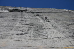 Pitch 5 is marked on the topo as a wavy arrow and the word "up" Scott and I should no better about last pitches on domes. Herring Creek was the same. Scott leads off yonder, passing another triple bolt belay for a climb to our right. Eventually we end up simulling for what seemed like far too long before finally Scott finally yells that I'm on belay for real. Easy climbing, but taking out the fairly small pieces Scott had been leaving and not seeing where the next one was wasn't exactly confidence inspiring. I recommend going back leftwards when you skirt around the rooflet above the start of Pitch 5, and belaying by the tree? Either way, you end up on top of Power Dome. Congratulations.