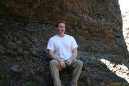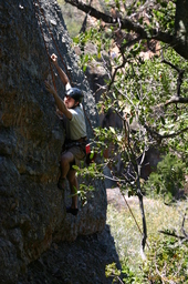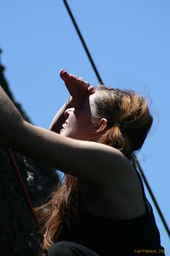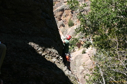 I got TJ set up to start belaying people up there, while I went off to belay Scott up Organgrinder. (5.8+) Gessara watched and learned how to lead belay. Scott couldn't quite pull it off without stemming across the chasm, but made it to the top quite quickly, and we got a second rope set up.