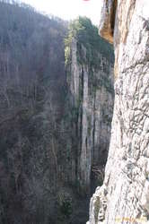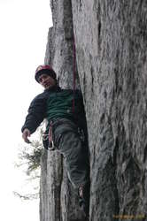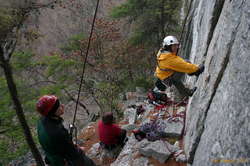 Yet again, we're not taking the obvious line up, it seems seneca is covered in routes going in all directions and link ups in every direction. Bruce leads off on another traverse, with less gear, but fortunately not as much air. We eventually end up on the main ledge, and go for a scramble off to our next climb.