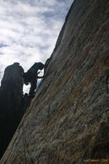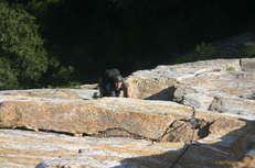More solid climbing, this time starting to really run from the weather that had been threatening from upvalley for most of the day, took us to a beautiful belay ledge, that's not marked in the Reid topo. Perfectly flat, roomy, space for two belays. I headed up some ominous looking finger cracks that turned out to be delightful climbing, some of the best that I had led on the climb, and then had to wriggle my way up the groove of the final pitch. Excavating pine needles and oak leaves for placements, and shimmying with the best of them. Cathy was not impressed at following this with the pack on.