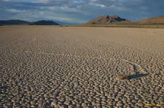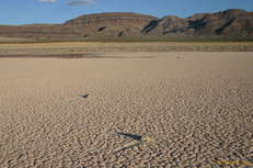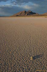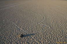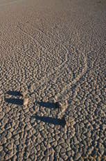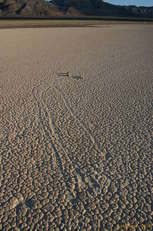 Partly due to washed out roads, and partly due to a desire to have a look at the other roads that lead into Death Valley, we came in through the North East entrence, past Scotty's Castle, but before we'd even reached the park entrance, we saw a great big mudflat/playa off the side of the road, and decided to go out and have a look at it. We were just expecting to see neat mud cracks and so forth, but much to our surprise came across two "racetrack" stones. They had left fairly short paths behind them in the mud at some point when the wind and water conditions were all just right, about a foot long. We quickly found more and more and more of them, some with paths as long as 100 feet, some as short as 1 foot. They squiggled, they turned left, they turned right, but above all, they were just absolutely fascinating.