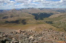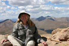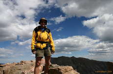 Karl on Mt Bierstadt, Mt Evans observatory in the background