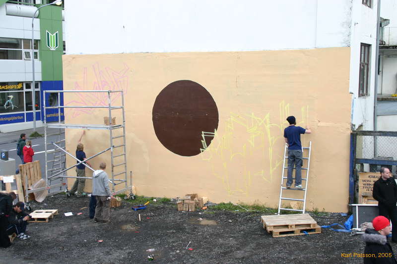 Big pieces require serious infrastructure. These guys had 3-4 boxes of different paints and rollers