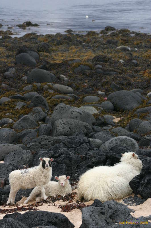 A ewe and her lambs by the seashore, near Búðir