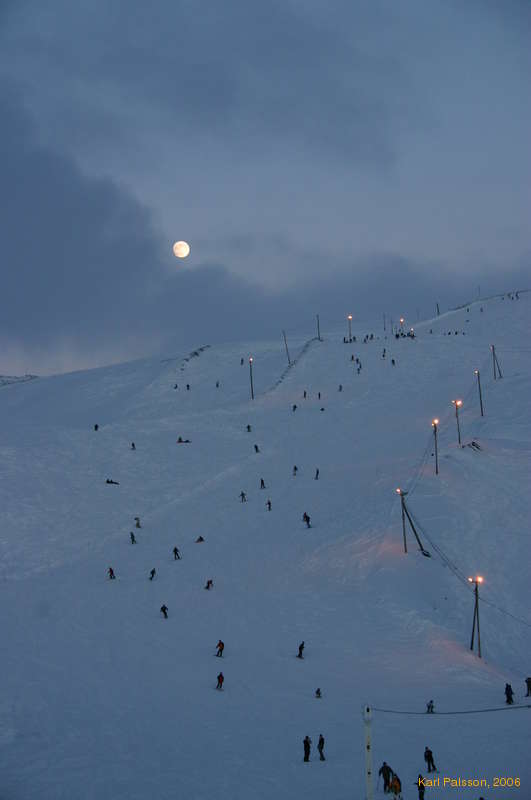 Lots of people enjoying some snow under a fresh moon