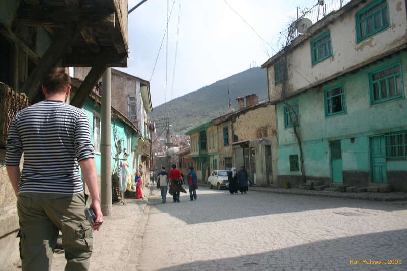 Jared walking down an old town street, complete with wattle and daub houses