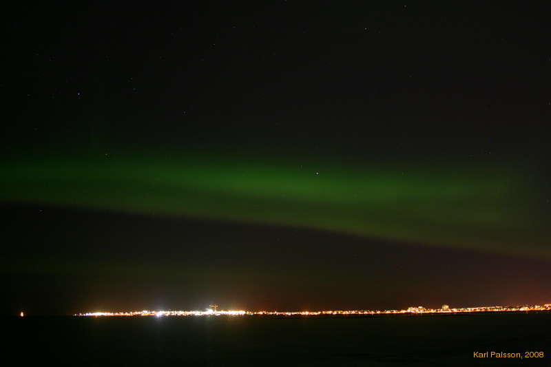 Aurora over Seltjarnarnes and Reykjavik, from Álftanes
