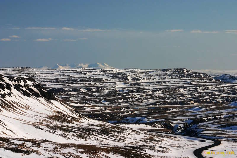 Snow on Þverahlíð, looking east from near Baula