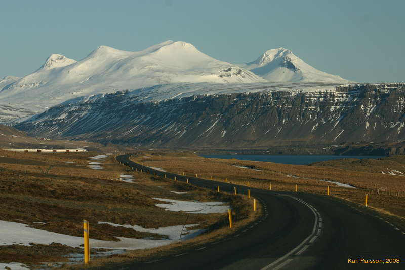 Winding down an empty road towards the head of Hvalfjörður, Botnsúla and Syðstasúla overhead