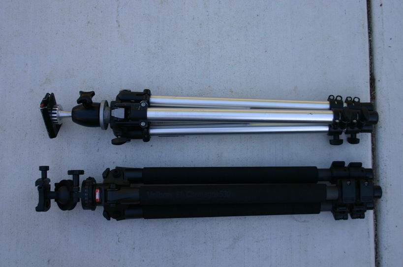 I dislike pan/tilt heads, so both of these tripods have a ball head on them. Because they don't have the same ball head on them, some of the weight difference is eaten up. For these photos, the Bogen had a Strobo FLM ball head (~$40) and the Velbon had an Acratech Ultimate Ballhead. (~$270)